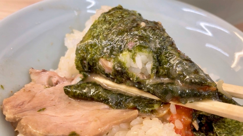 もうこうなったら・・・海苔を巻きつけ倒して味わいます!。海苔を乾いたまま麺の上にかぶせ、箸で両端を押さえながら沈めたところで箸を閉じ、静かに持ち上げる・・・そして口にそのまま運ぶという作業をただ繰り返すします。これが世界一楽しい単純作業といえましょう。
