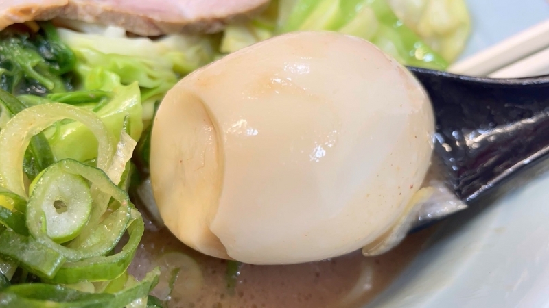 家系で味玉を滅多に入れないんですが、今回は全部のせなので。全体的にワイルドな味の展開の中で、味玉はほっこりとさせます。淡麗な薄出汁がしっかり浸透した様な丁寧な仕上がり。まさに半熟玉子の様な柔らかさで、白身はプルプルとしており出汁が染みてそのままでも味わいがいい。