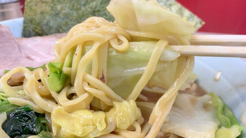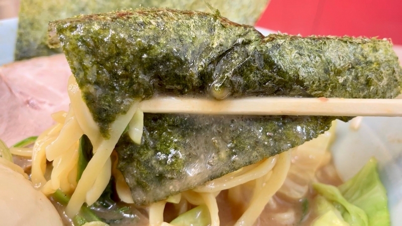 そんなに家系に詳しくないものの、実に王道なる豚骨醤油感ですな。まず色合いがそんな感じ。近年、家系を名乗らないニューウェーブ家系が活躍していますが、豚骨醤油感も微妙に違いがありバリエーション増えたのではないかと。鶏油を感じる琥珀色強めだったり、豚骨煮出しがメインに押し出された乳化系白濁強めだったり色々とあるかと。そんな中で、実に家系と感じる「赤みがかり」を感じる出汁感です。