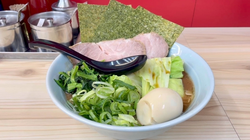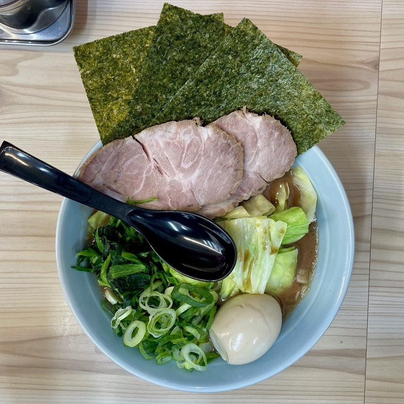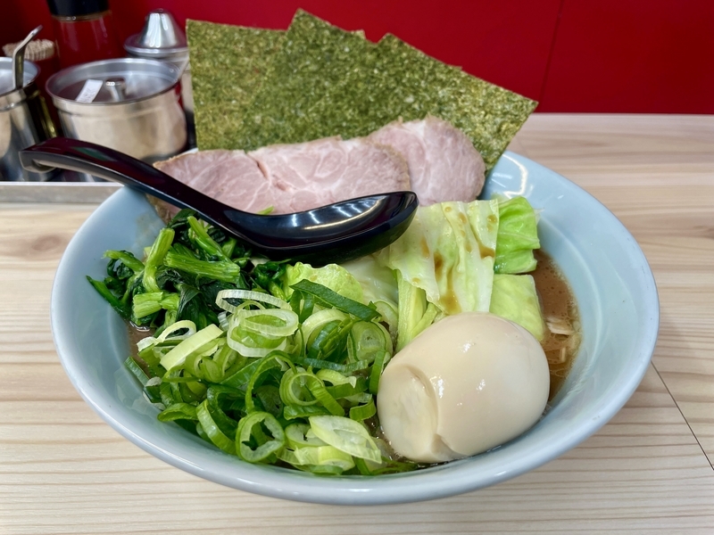 で、実際の配膳されたのがこれです。おおお!期待通りとはこのこと。読み通り味玉プラスな上に青葱が多めじゃないか。そしてキャベツが予想以上にしっかり入っとるのが更に嬉しい。チャーシューと海苔の厚さと整う重なりは、見ていて凛々しく感じる。特製ラーメンより迫力あるんじゃないかな?。オススメかと!。