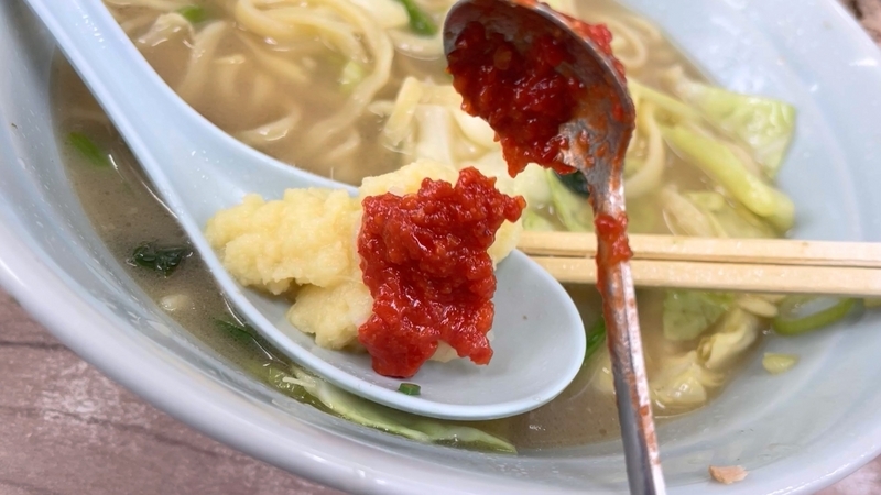 「生姜」は、テーブルセットにはないので、店主にコールして貰うスタイルです。今回も「生姜メイン」。生姜をかなり多めに投入してみました。そして「ニンニク」はアシスト。「豆板醤」で仕上げるという流れ。これにより豚骨醤油のベースに生姜のジリジリとした刺激が溶ける感覚です。