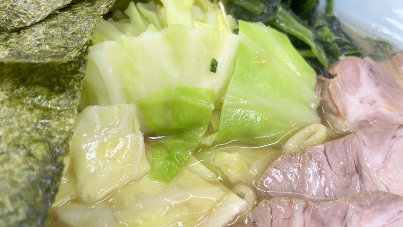 割としっかりめに湯通しされた温野菜感覚。外側の部分は半透明になっており、また芯に近い部分は白くよく茹で上がっております。外側はしんなりした食感。中心部はホクホクとした歯応え。噛み締めると野菜独特の淡い甘さを感じます。その汁が重厚な豚骨醤油出汁に溶け込むと、余計に全体をマイルドに仕上げてくれるのも好印象!。