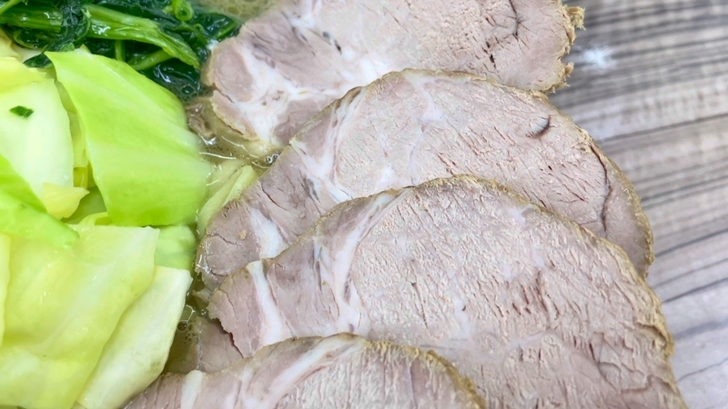 <チャーシュー> 器からはみ出る大胆さ!塩気も多めでご飯にも合う!パフのように決まった歯ごたえ!