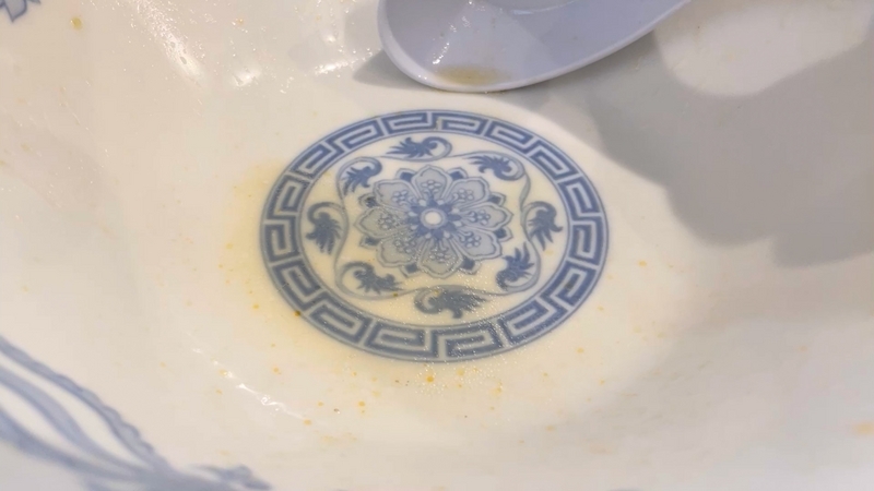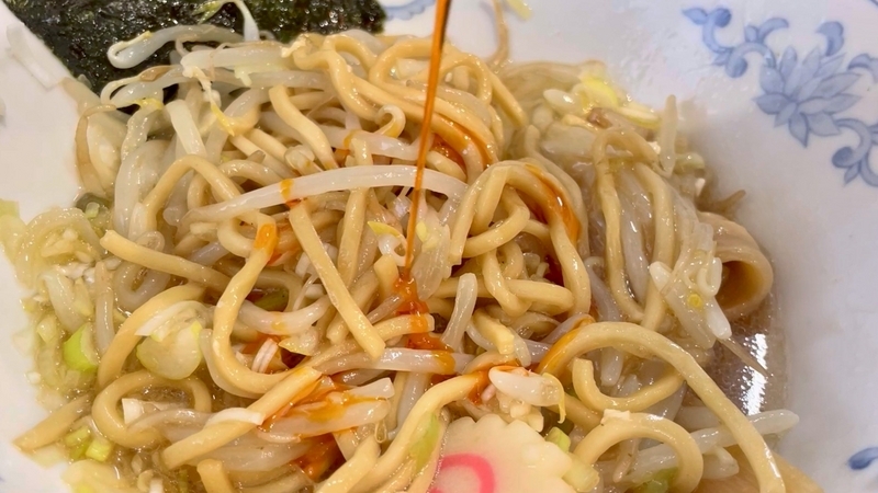 別に葱追加とコールしたわけではありませんが、元来ネギ好きだとこの店ではバレてるようで、これぞ常連の特権というやつでしょうか(笑)。なので多分多めにネギ増しをしてくれているのでしょう。このネギが甘さが良いね。淡い葱清涼感を伴う風合いがナイス。あとで辣油を垂らすがその辛味ともマッチです。
