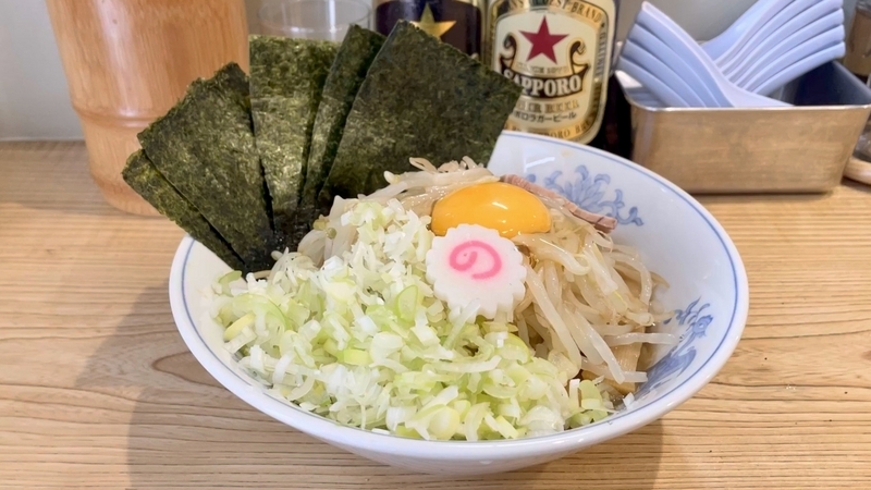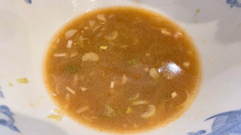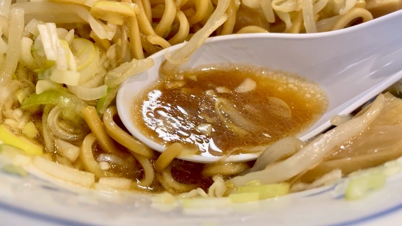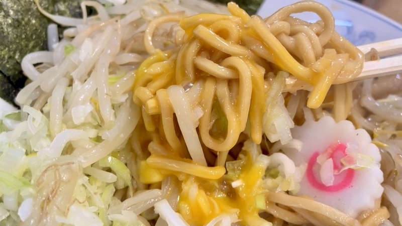 油と醤油ダレの混在が、汁なし系だと高めな印象。醤油が下味甘味とじっとり広がるようです。後半になる程、やや麺の吐き出し感が溶けるところも、コクを増すと言った印象。また、薬味ネギとモヤシの汁気もじわじわと後半になると滲むので、カエシの感覚が柔らかくなるようです。もちろん麺の風合いもタレに混じって徐々に甘味をます・・・。