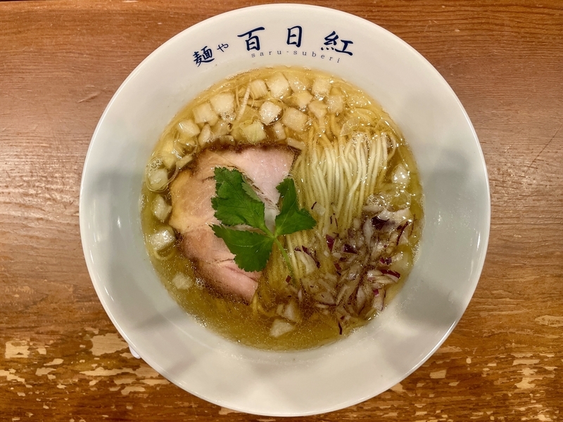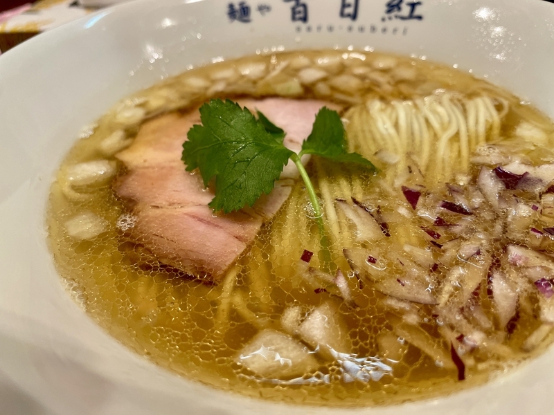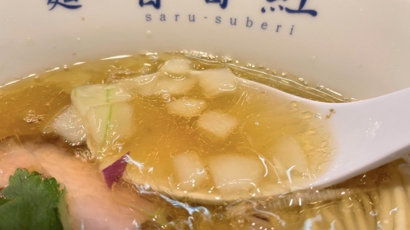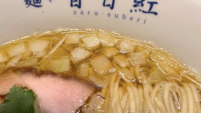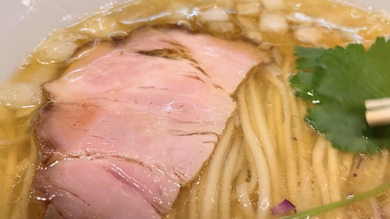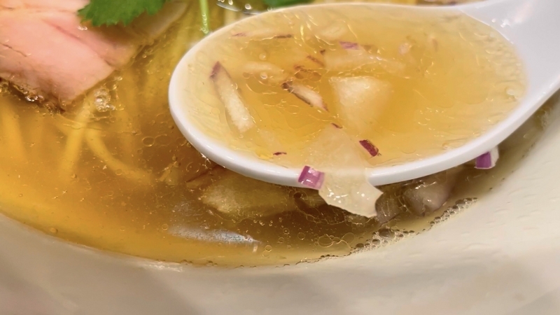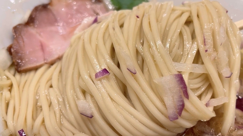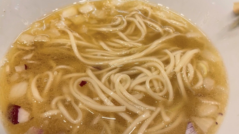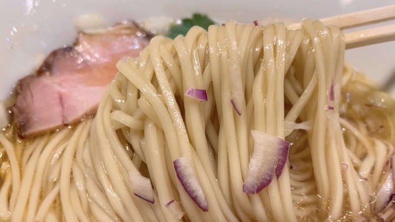 もう9年も訪問ご無沙汰にしており、記憶もすっかり抜け落ちているのですが、それでもこんな出汁感では無かったと確信します。こんなに透明感とエキス感が映える塩出汁ではなかったかと。鶏豚系のエキス感と魚介系の出汁感のハーフ&ハーフな印象。薬味がまた映えます。玉葱と紫玉葱の粗い微塵が惜しげもなく投入されており、薬味と言うより具材といった感覚もありなむかと。