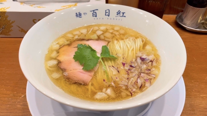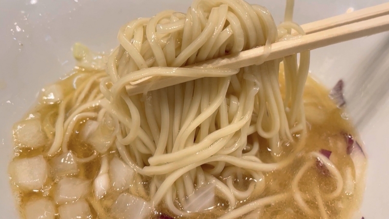 実は麺が旨かった。美しく整う麺線だけでも嬉しいが、箸で持ち上げると紫玉葱は適度に貼りつき、まるで川の流れに流れる花弁のような風雅さを感じます。そして表面がまるで漆喰を思わせるきめ細やかさと落ち着いた表情。一般的人気のツルツル光沢麺とは一線を画する感覚です。