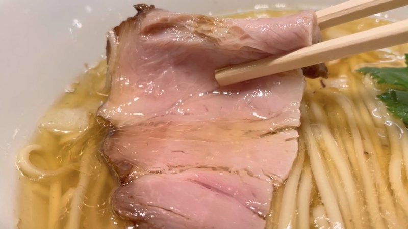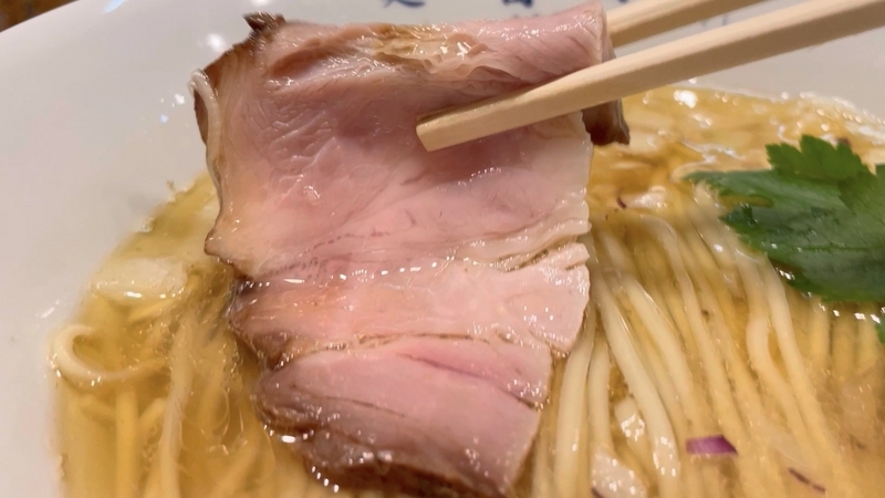 <チャーシュー> 一片でも存在感ある低温系豚肩ロース!周囲の醤油ダレの浸透と中の赤身肉味との味わいコントラスト