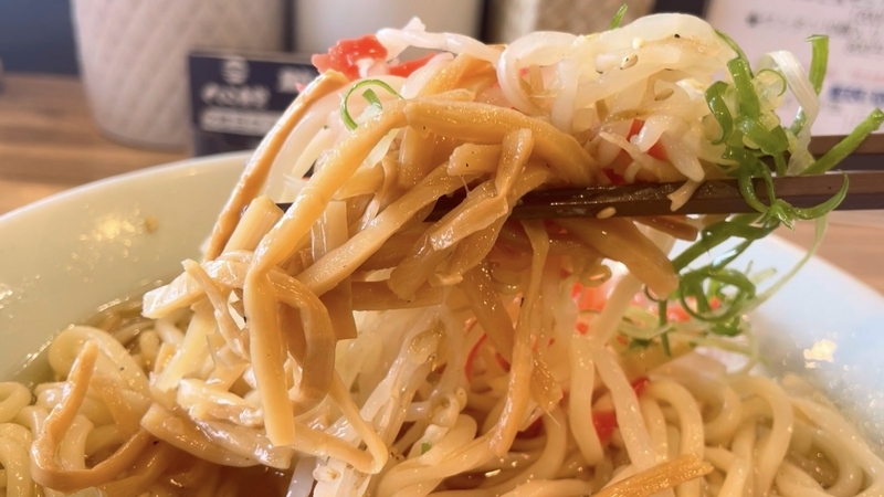 <葱・もやし・細メンマ> とにかく冷たい麺に絡みまくり歯応えを楽しませてくれるアイテム