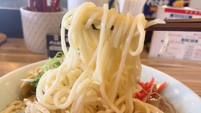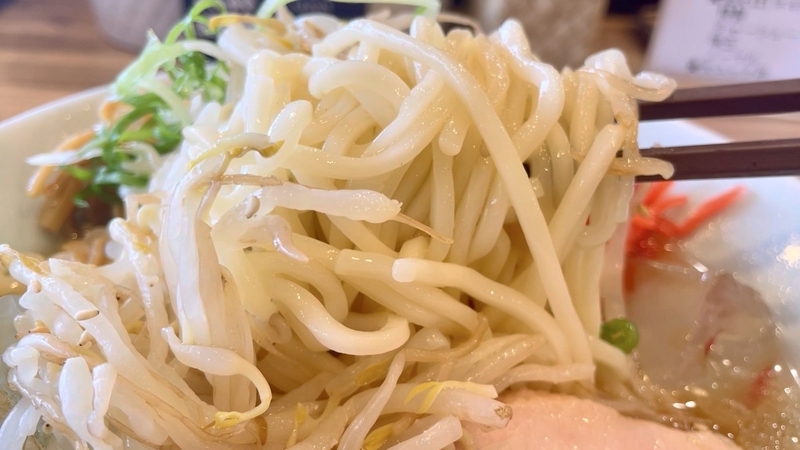 <麺> 無かんすい!?白地でモチモチ弾む多加水系中太麺!縦伸びしそうな強いコシ!噛み締めて旨し!
