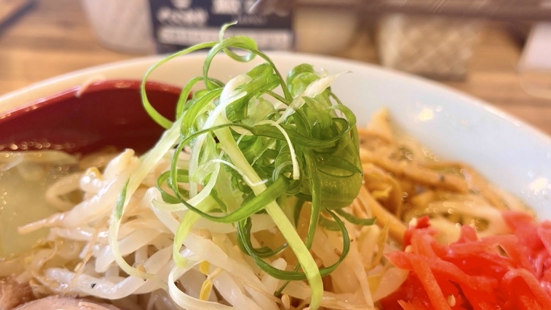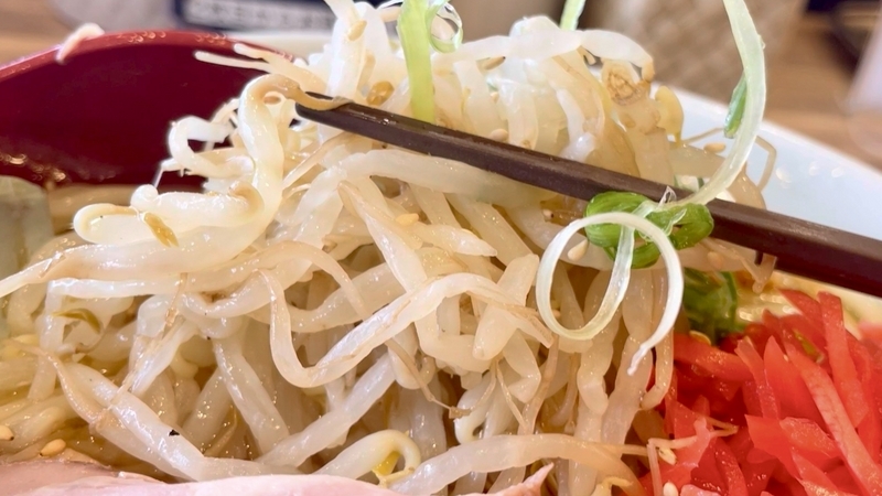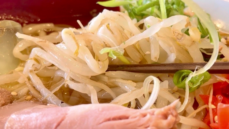 そして具材のニュアンスも微かに染みていい感じ。例えば分かりやすいのはやっぱり紅生姜。うっすらと生姜のニュアンスが広がっており清涼感を演出しているようです。そして茹で(炒め?)もやしもしんなりしているようで、もやしらしい淡い野菜感も醸しだし、魚介系の出汁にマッチ。