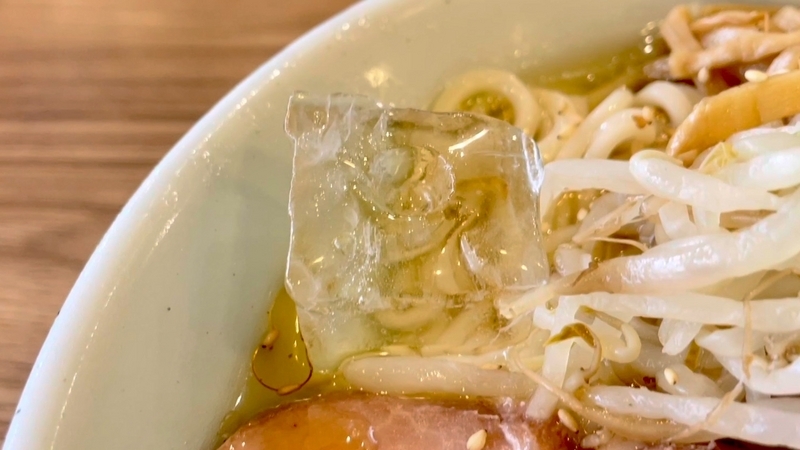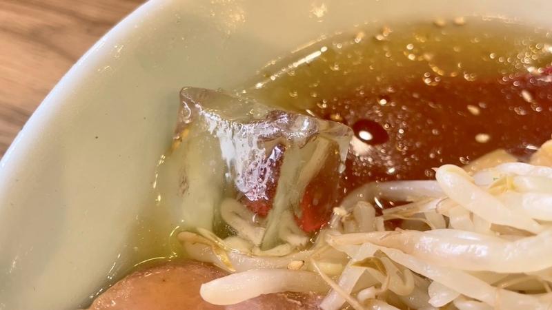 おお!今年は紅生姜が入ってるのね!それと氷がもしなければ、ほぼフツーの中華そばに見えます。紅生姜が入ってるだけで、冷やし中華の感覚を少しばかり感じさせるでしょうか?見栄えとしては。そんな意識もあって出汁はキンキンに冷えてていい感じ我します。