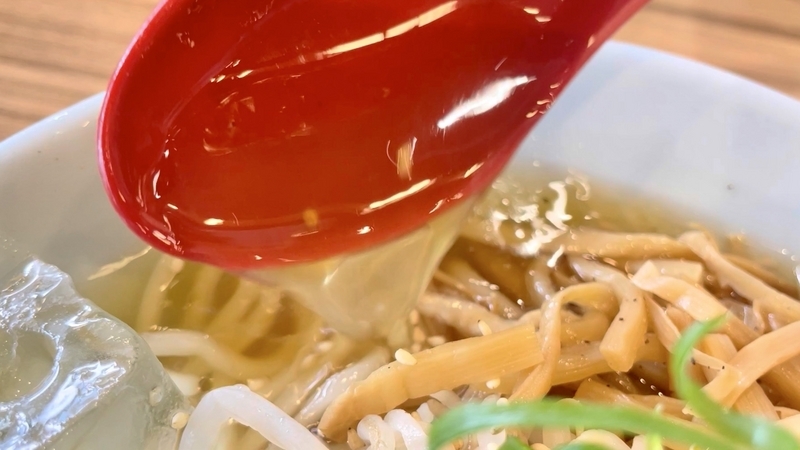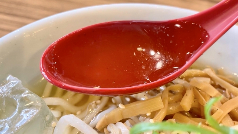 魚介メインのさっぱり和風出汁感!。冷たいので塩気が伝わりにくいところを計算に入れたようで、薄口醤油?ひょっとして白醤油??の輪郭も伝わります。節系の香ばしさも伝わりますが、味わいとしては煮干し系のニュアンスが個人的には効いてると感じます。まさに抵抗感なく、ポカリスェットの如くゴクゴクと飲み干せるライト感覚!深い充実感に包まれます!。