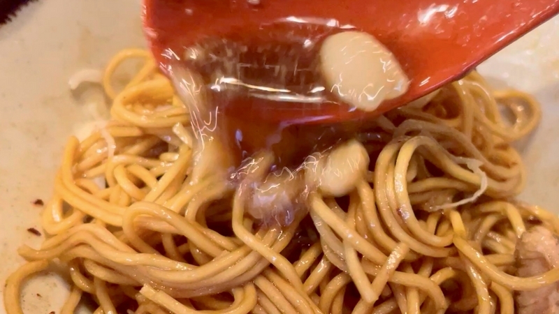 途中で出汁を垂らしましたが・・・このままがかなり香ばしく味が濃ゆいので楽しめるかと。特に今回は、背脂の塊が混じり合い、微妙な弾力も混じり、脂の甘味も加わりますので旨さが広がりましょう。