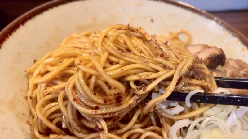本体と合わせて和えそばの味は「タマリ」とさせてもらいました。これでダブルブラック!。これも当然山椒と合わせて食らいます。特にタマリ醤油のタレがダイレクトに楽しめるので旨い!。