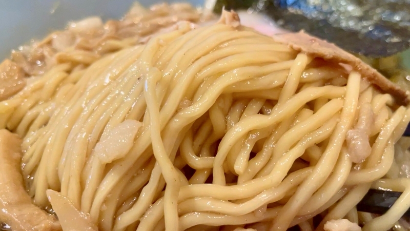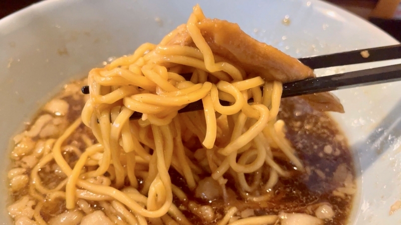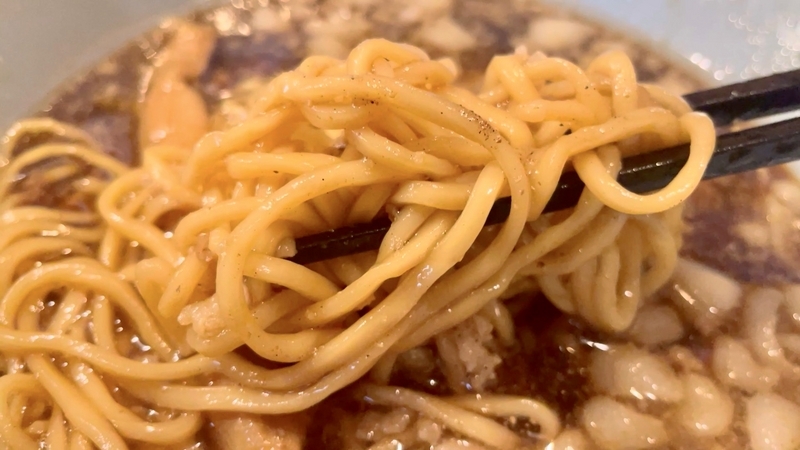 ううう・・・いい感じ。磨きがかかった明るみある漆黒出汁!醤油の深みに円やかさが広がり、黒味がかった色合いが執事さを醸し出します。そこに背脂の小さい塊が浮く姿。ワイルドさもありつつ、和風に落ち着く表情と申せましょうか?。