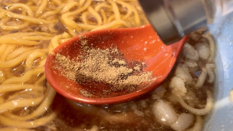 スッキリしたブラック鯛煮干出汁にカエシの部分がこの山椒で刺激を受けて旨さ増幅。ヒリリとしない和山椒パウダーですから入れすぎてもダメージは少なそうです。激しく同意です。つーかついついどんどんと足してしまいそうになるほどハマるかと!。