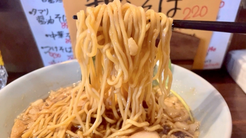 大衆的中華そばって感じにさせるタイプ。短冊型のオーディナリーなサイズ感で、歯応えがクニャコリ!とするタイプです。下味が割と深めに浸透し、わりと深めな味付けですがタマリ醤油との相性も良いのか、出汁に浸した方が旨いです。