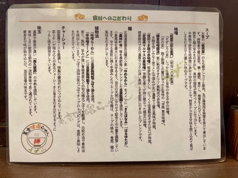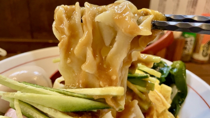 使用する味噌は、近年変えたらしく蘊蓄によると「糀屋三郎右衛門・鎌倉味噌醸造・マルヤス麦味噌」。おそらくそれらをベースにしていると思われます。感覚的には甘みと清涼酸味が、芳醇な味噌コクを華やかに仕上げ、そこに冷たさが味わいを高めます。その味噌ダレの冷えっぷりには、妙に仄かに爽やかに広がる酸味があり、味噌独特の風合いも豊かでまさに芳醇。塩気も重さも感じない味噌味なので、トッピングの具材とも相性が良いです。和えれば何にでも酒の肴に化かしてしまうかも?。他の料理にもアレンジできそうですな。華やかな風合いも生きる仕上がりで、麺の素地からくる風合いもマッチします。