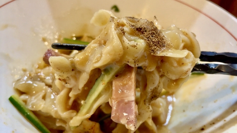 「深浸透」&「熟成甘味」だと濃ゆい目の色合いなんでしょうが、白身はミルクティーに近い明るいクリーム色。じっくりと深い旨味が浸透する味玉です。それだけに辛味噌の中にあっては、箸休め的に貴重だったし、辛い&甘いの橋渡し役にもなっていたかと。