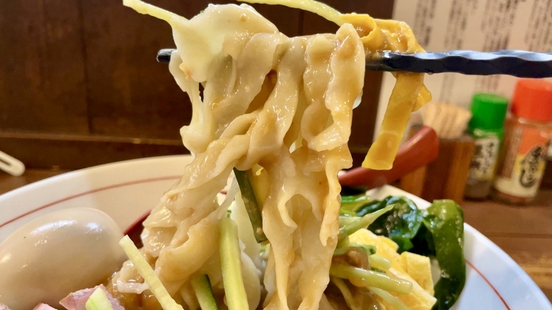 麺は、定番の肉厚ピロピロ太麺で、相変わらず素朴さをアピール。その一方でティピカルで鮮やかな具材が整然と揃います。この対比が素晴らしく、更に冷やし味噌ダレの絡み面白さが広がるようです。今回は大盛&特製としたこともあって相当な迫力アップかと!。