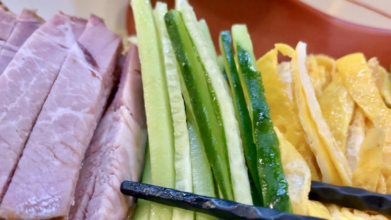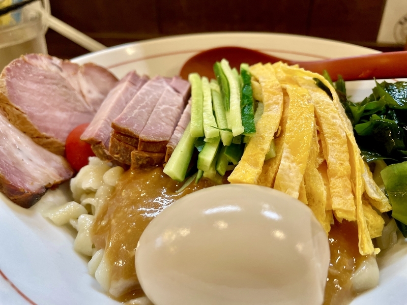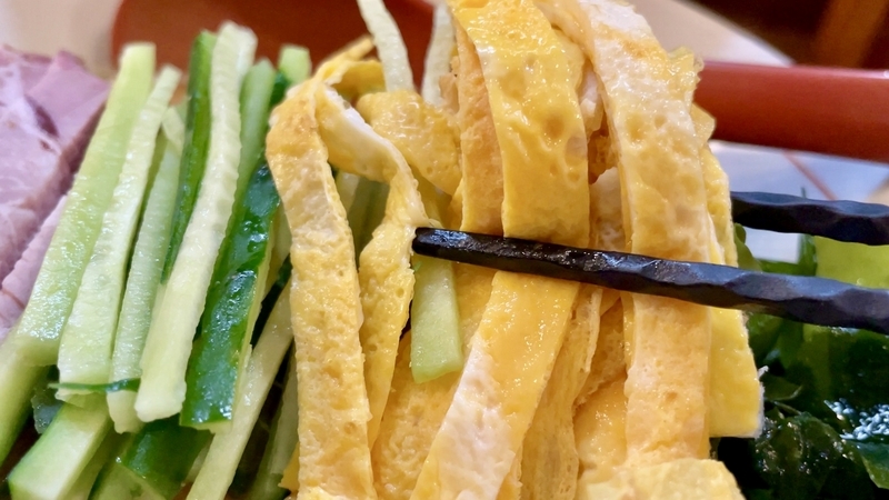 王道の卵焼きと千切り胡瓜が嬉しい。胡瓜は、シャキシャキなフレッシュで、芳醇な味噌ダレが絡まるのはやっぱり格別!。そんな胡瓜の瑞々しさとは裏腹に、家庭的とすら覚える安寧の卵焼きもいい感じ。レギュラーの味玉のせて終わりってのも不満はないが、やっぱり冷やし中華のフォーマットにこだわり卵焼き乗せる心意気を評価したいと思う次第。