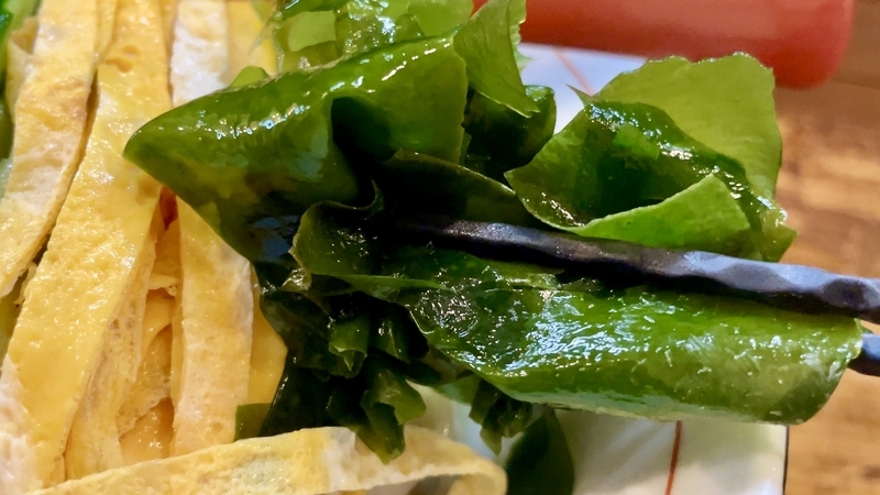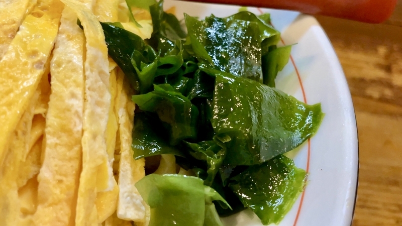 ワカメの質感が大変良いね!肉厚なのが気に入っており、まるで刺身のようなワカメではないか。さらに味噌に合う仄かな磯風味を演出してくれるようです。普段はワカメを好んで食わない人間なのだが、今回は気に入った!。そして色合いの赤としてプチトマト。確かにこの味噌ダレには紅生姜は合わないが、色合いは欲しいところを演出してくれる仕事ぶりがナイスです。