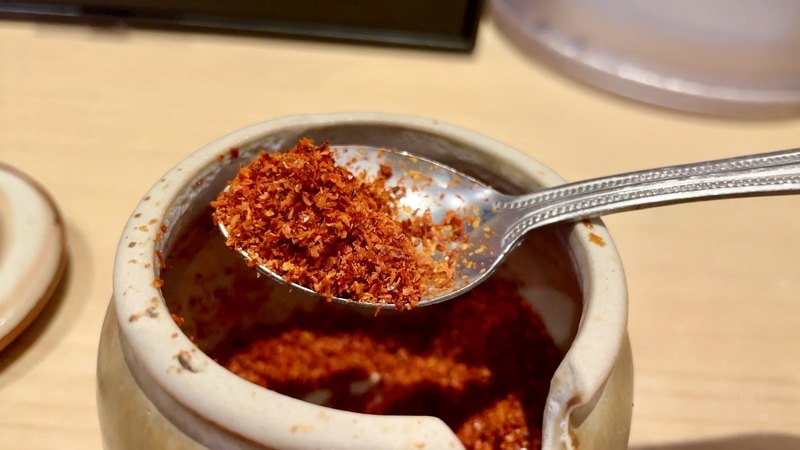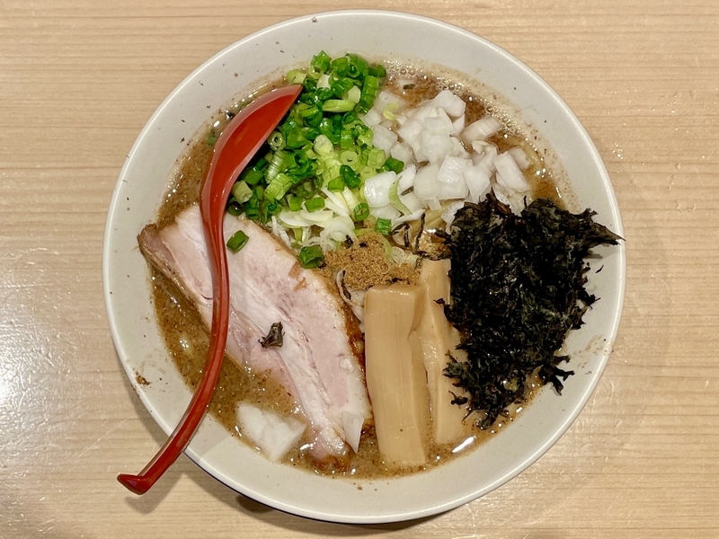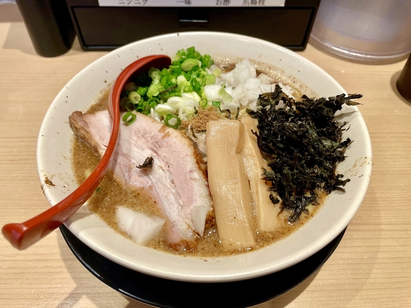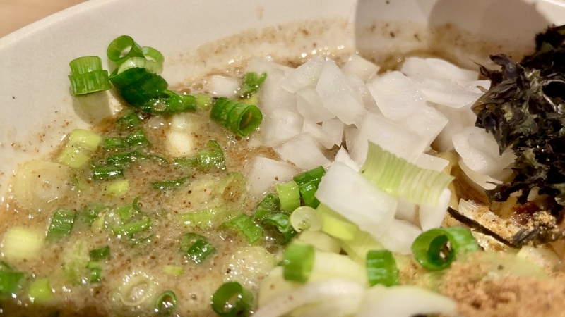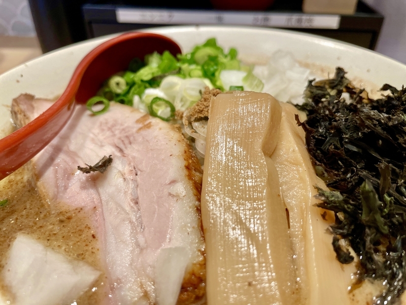 配膳の瞬間、煮干しというより味噌のインパクト?。宣材では少し煮干し系の色合いを感じたのですが、ほぼフツーの花道庵味噌って感覚。しいて言えば岩海苔があるので煮干し系の個性も感じる程度です。