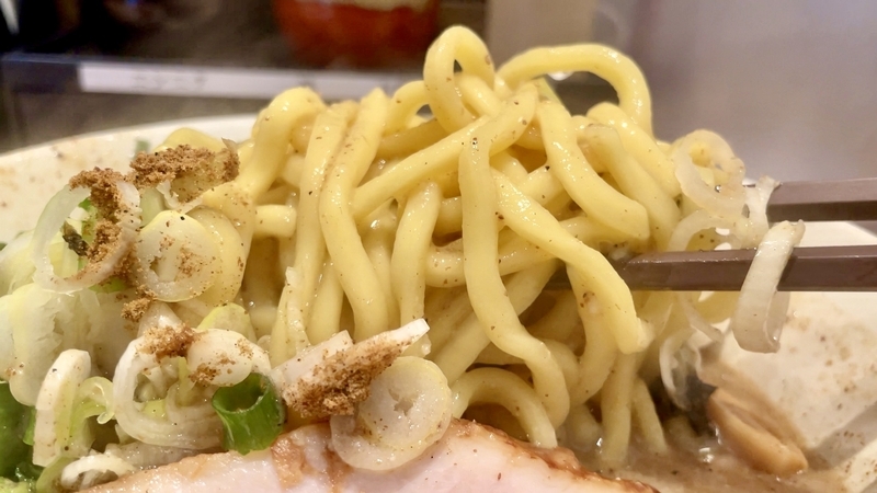 やっぱり麺は味噌系に合わせた黄色い極太麺。デフォルト200gでボリューム感あります。前回も感じたが全体的にカタメな印象で、前歯を立ててかっつり食らい始めます。表面は意外とつるっとしており、素地の風味も少しばかり感じるか?。また奥歯へ運んで潰すと出汁とガッツリと合わさる味わい。濃厚煮干だと細麺ってイメージもあるが、味噌&煮干なので味噌感覚が主導して一気に食らいつくします。