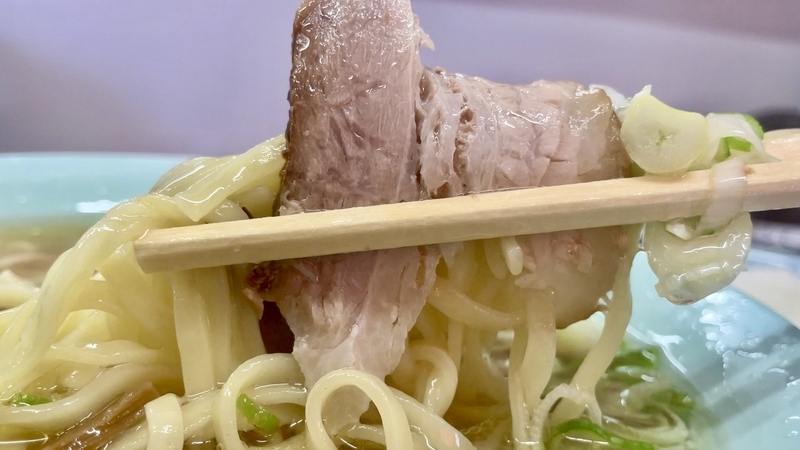 スープをバクバク吸い込みまくり。まさしく肉のスポンジ状態で、下味とスープの味がマッチするので更に柔らかい旨さ!断面のしっとり感があるし、手切りの後が断面に伺えます。とてもソフトな歯応えで、薄味とは言え円やかな下味が絶妙。肩ロースの赤身が多めって言う感覚で、赤身の旨さと脂身の甘さが、スープの旨味で更に高まってます。