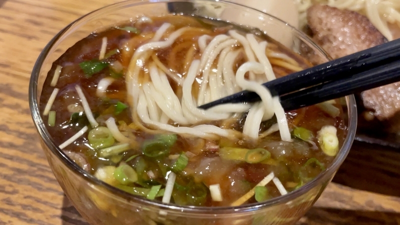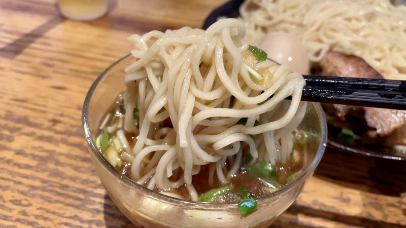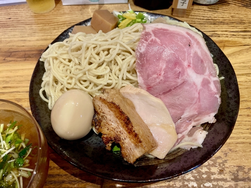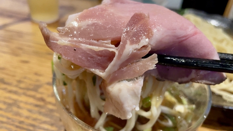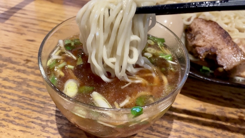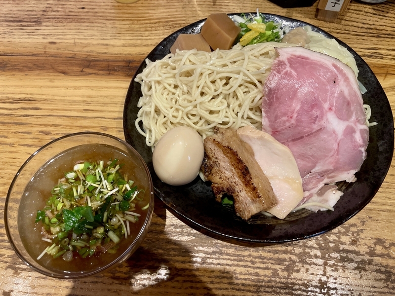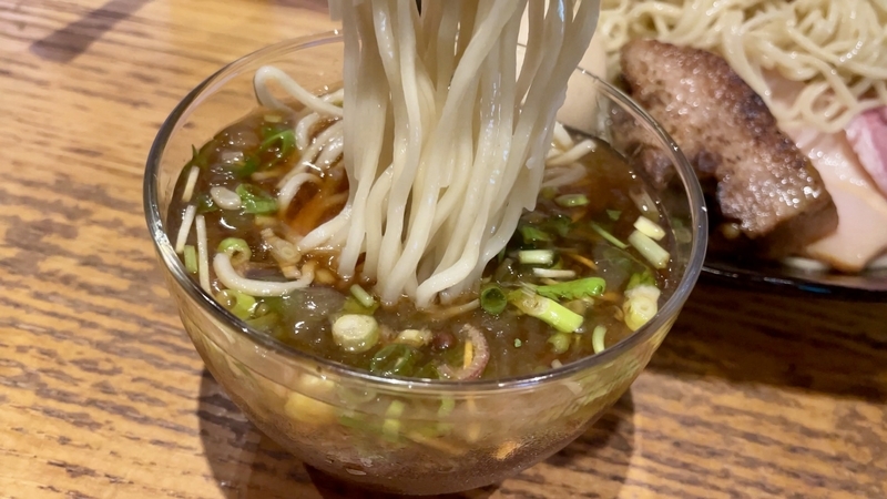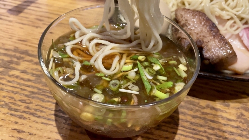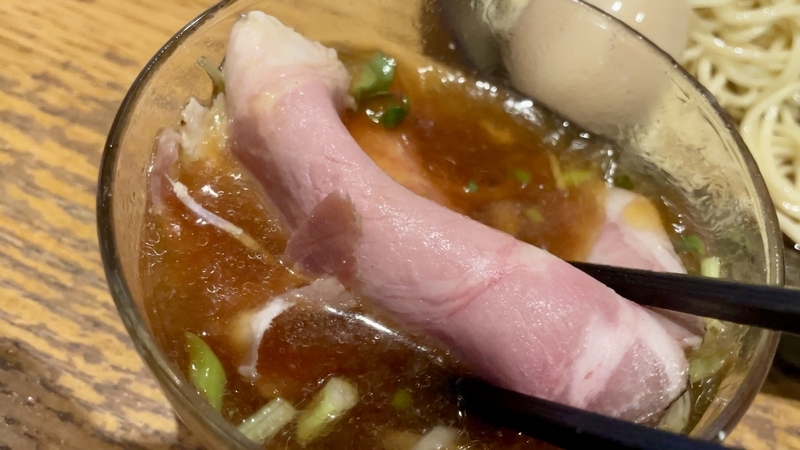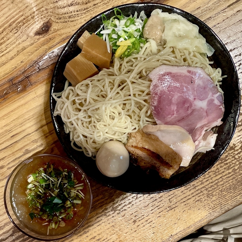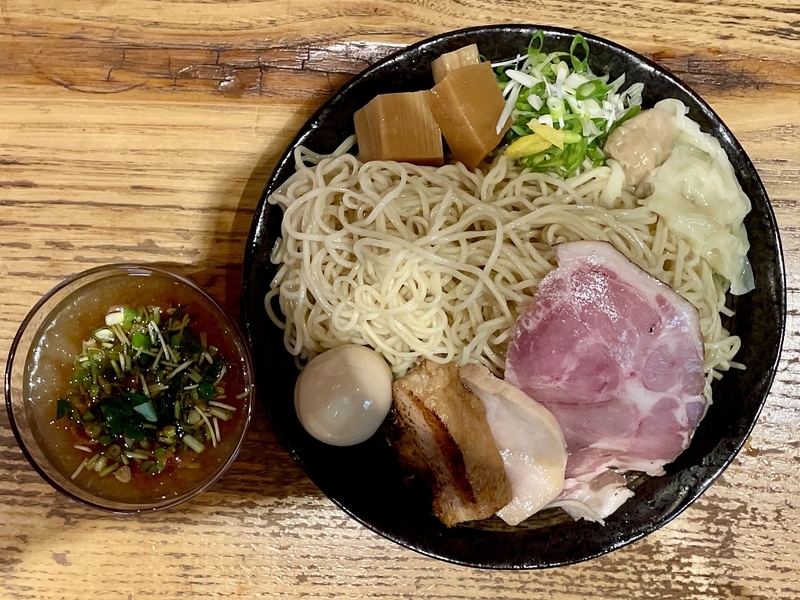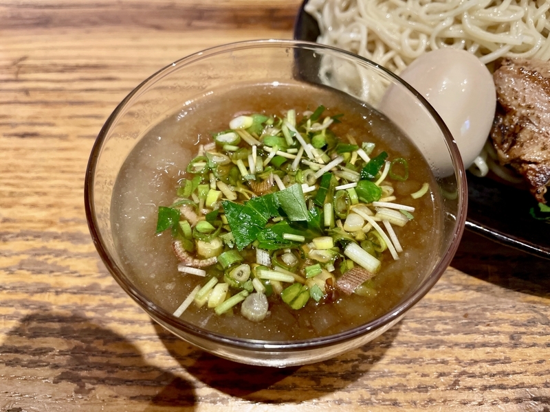 うわぁ!何だこの麺のボリューム感は!ざるの底上げ感かと思いきや、ざるは平皿に敷かれただけなので底の空間はほぼない。確実に2玉と思われ、いやそれ以上にも感じ取れ、量的迫力がハンパない。そして当然特製だから具材もしっかり。特にこのお店は豚肉へのこだわりが強く、炙りと煮込みと低温調理という技巧を尽くしまくっている。さらにワンタンと味玉がつくわけだから値頃感もしっかりしております。また技巧といえば・・・つけダレ。昔ながらの甘塩っぽい醤油つけだれじゃなく、キンキンに冷やされ薬味もふんだんで清涼感が溢れまくりじゃないか。はっきり言って全体的によくできてる!。