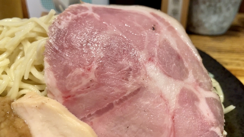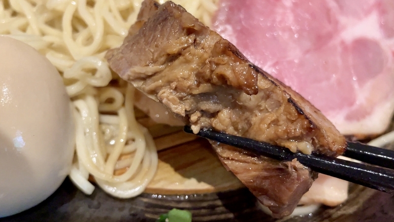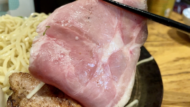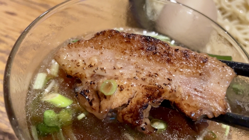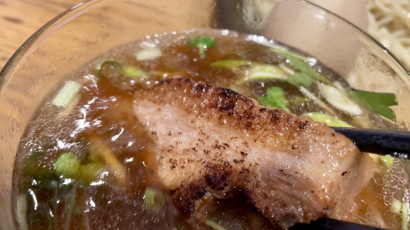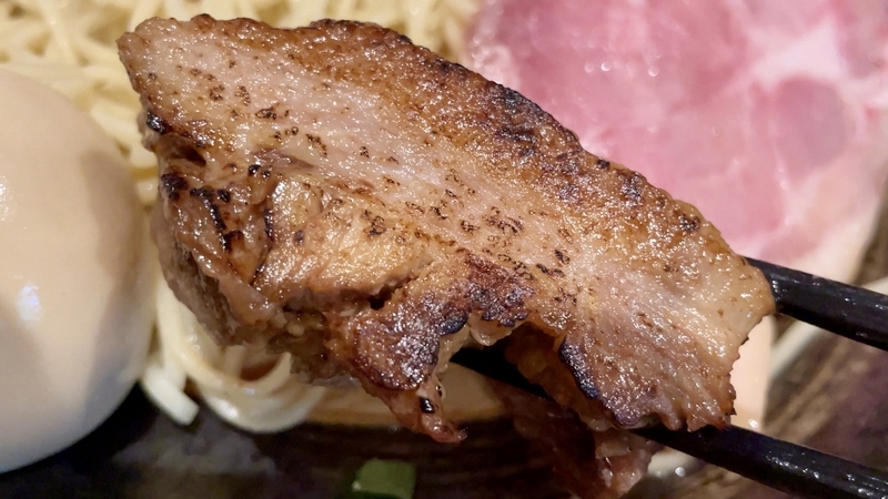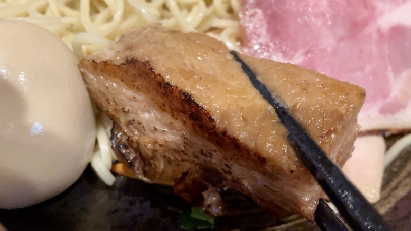 最後に煮豚バラ肉の炙りでが投入!。分厚くブロックカットされ、とろとろな状態で炙りです。染みたタレとつけダレの味わいも染みて旨し!。