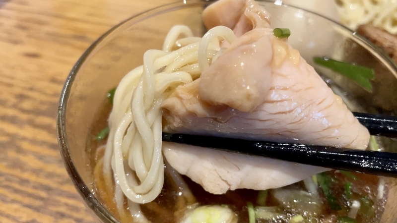 続いて鶏胸肉。低温調理系のコンフィのような肉で、実に上品で淡白な旨味がナイス。化粧パフに匹敵の柔らかさで、これが柔らかい醤油出汁をスポンジのように吸い込み、噛み締めて鶏肉の滋味と合わせて一気に吐き出すようでこれまた旨い。