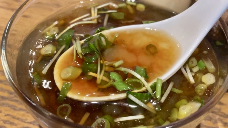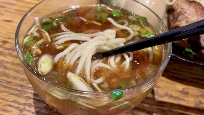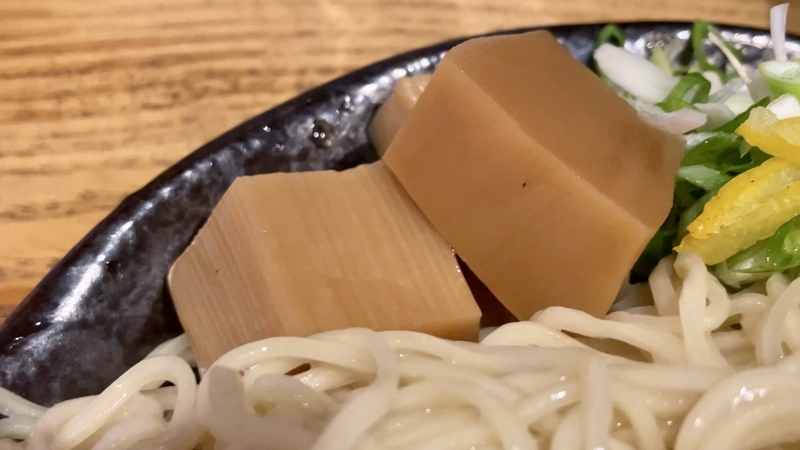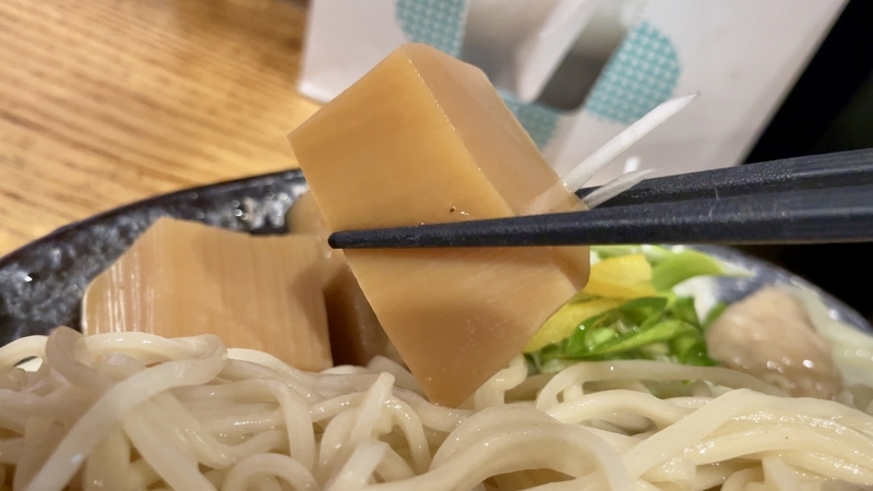 かなりご立派な材木メンマで、優しい出汁がしっかりと浸透した味わいです。繊維質が細かくて柔らかい。前歯を当てて力を入れると、どの方向からでもサクリと気持ちよく千切れます。さらにつけダレの味わいも浸透させるとこれまた旨い!。