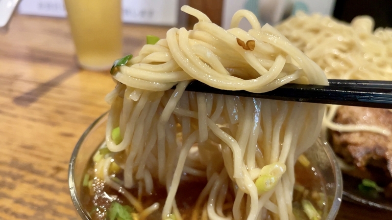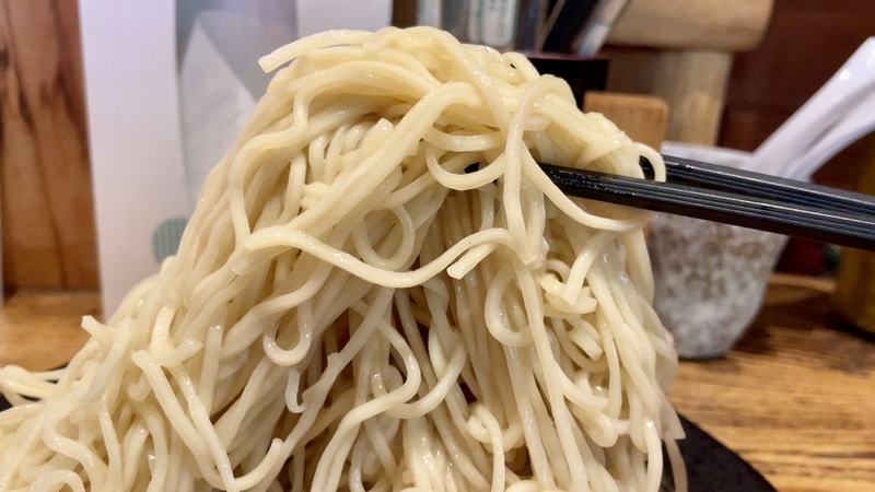 ざる中華だと多加水系のモチモチ麺かと思いきや、とても風味よく質感も楽しめる細麺でした。想像より素地の風味がナチュラルに楽しめる感覚で、表層はツルツルとして粘りが少ないイメージ。出汁を絡めて浸透しやすくも感じます。また歯応えがとても好みで、プツプツシコシコとした歯応え!。