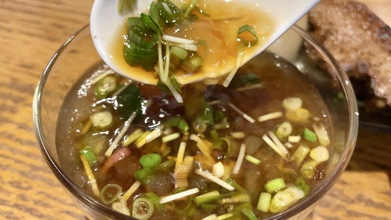 <つけダレ> 葱他香味刻みふんだんの柑橘系醤油つけダレ!鶏エキスの煮凝りがプルプル浮遊し楽し!