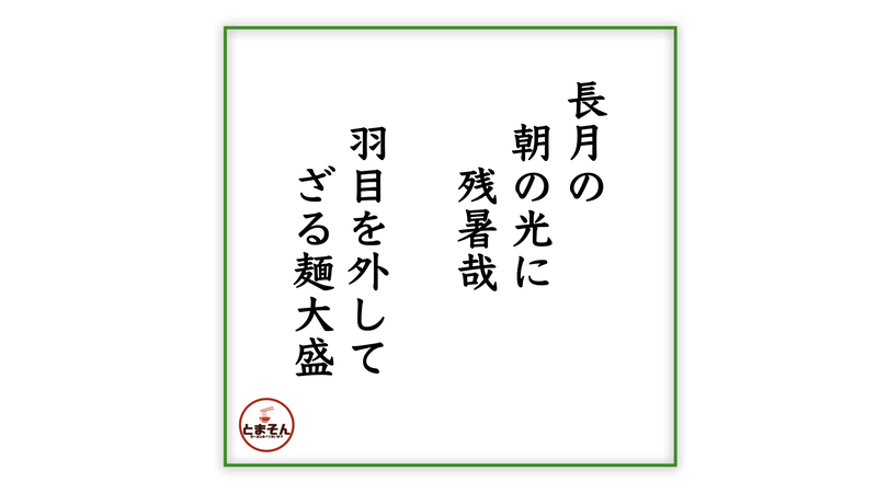 ・・・と言う感動の嵐!。おそらく夏期間限定のメニューと思われ、9月中旬に食えたのがラッキーでしたが、しばらく残暑も続くようですのでもしタイミングに間に合えば激しくオススメ!。これ毎シーズン食いたい気分!自信を持って旨し!なので・・・とっとと最後に詠って、いつものように締めたいと思います!。