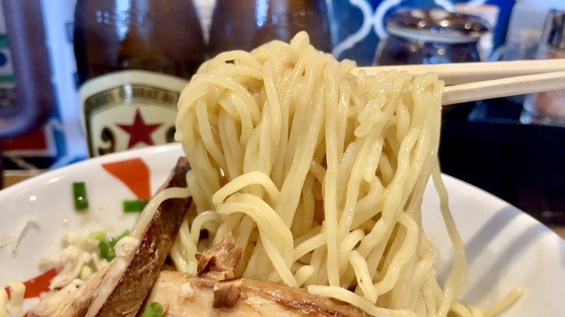 <麺> 明るく弾むモチモチ多加水麺が出汁に絡み持ち上げまくり!出汁を貼り付け滑る感覚!