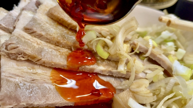 嗚呼、醤油ダレがやや強めなのが特に良く、クチに運ぶと舌の熱で脂身の蕩けた甘味が広がるじゃぁ〜ないか。調味料の降りかかる塩気が良いのです。更に刻みネギのザクザクさっぱり感が押し寄せると旨さが旨い、麦酒に最適とはこのことです。当然のようにカウンターの自家製辣油を垂らしてもしっかり堪能し尽くします。