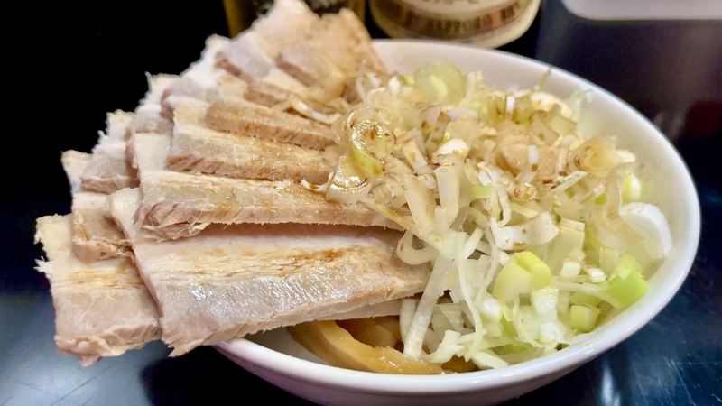 デフォルトで豚バラ肉が6枚づつ上下二段に並んでおり、何と1ダース。薬味のネギもケチケチしておらず。底にはメンマが敷き詰められてます。ラーメンとチャーシュー麺の価格差250円だから、この一皿ダブル盛と言う感覚です。なのでワンコインとはかなりお得感!。常連は切り落としの持ち帰りをよくされてます。
