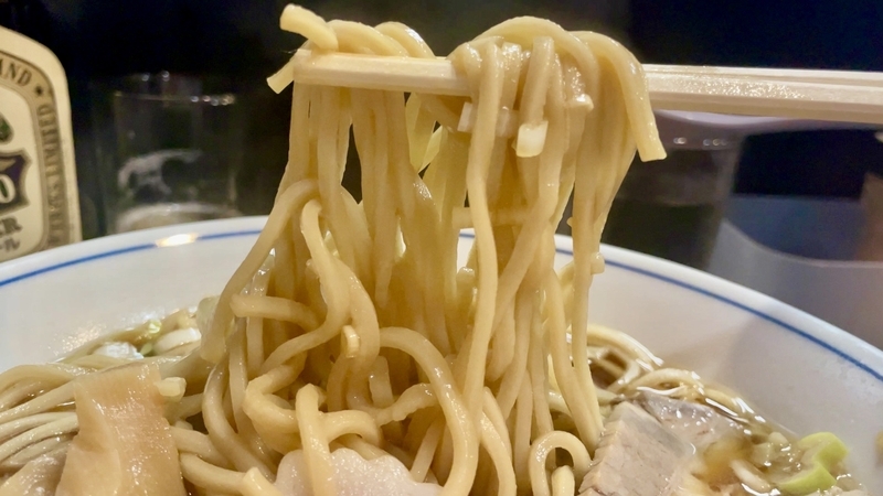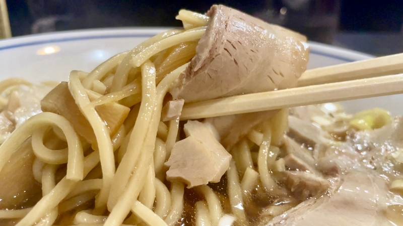 昔ながらの中華そばと思わせるところです。とてもサラサラとした仕上がりと、軽い豚の旨みが醤油出汁に染み入る様子。他に野菜類・昆布類等の旨みが溶ける様子もあるが、かなりスッキリとした印象です。そこに醤油の輪郭が現れるかと。