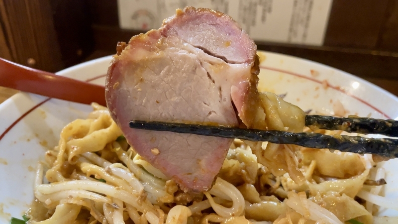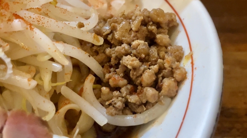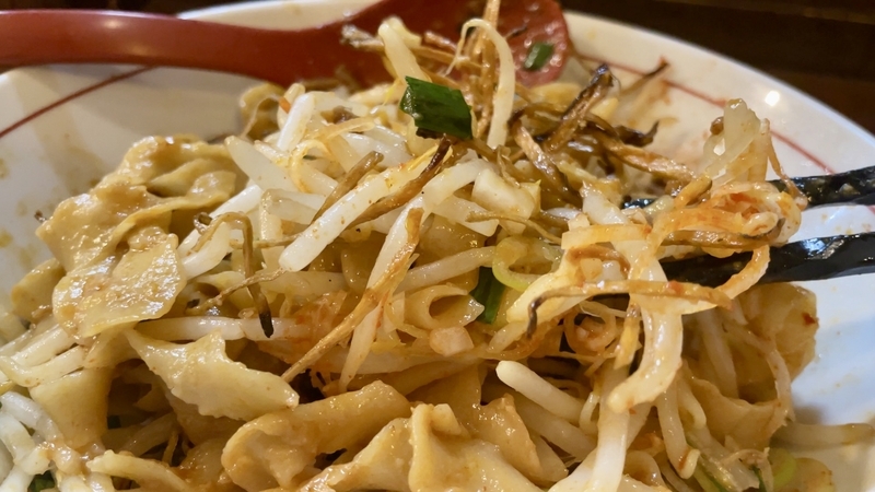 粒もそこそこ大きめで、これもまた全体に散らばると、極太ピロピロ縮れの隙間に挟まってしまいがち。麺をかじるとそこに挽肉が隠れていたということがよくあります。山椒の痺れやトウガラシの辛さはなく、本当にナチュラルに肉あじと味噌だれ、そして醤油系の風味を感じます。炒め過ぎずもせず、味が染み通っている割にはふかふか。