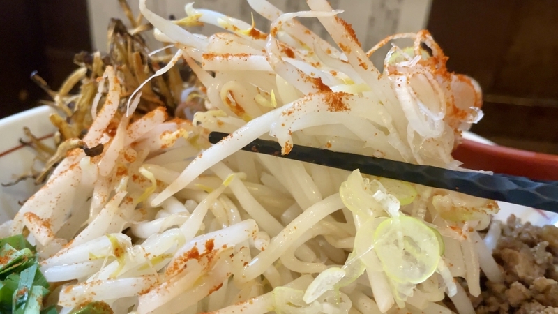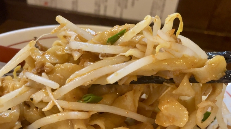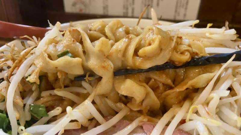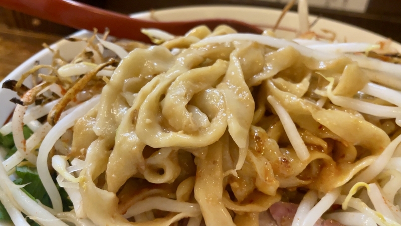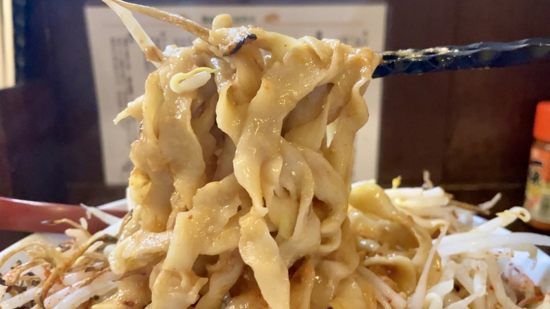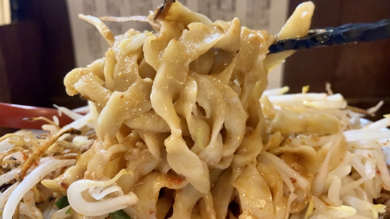 全体的に湯気立つのは熱々なモヤシがあるから。そしてその歯応えはシャキシャキ!汁が迸るようです。濃厚タレに絡んだピロピロ太麺に巻き込まれる。かき回せうとどうなるかと言えば・・・モヤシの方が服従したように絡み落ち着きます。濃ゆい味わいの中に、フレッシュな野菜甘味が実に調和しつつ、異質な歯応え同士がぶつかりあって尚旨し!。