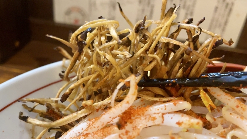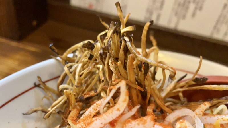 今回は辛味噌バージョン。食券渡す時に「辛味噌」とお伝えください。何と言ってもこちらはアイコン的存在のゴボウ素揚げが素敵。少し奥に控えてますが、見ただけでパリパリとアミューズを感じさせます。