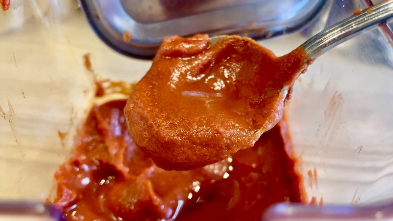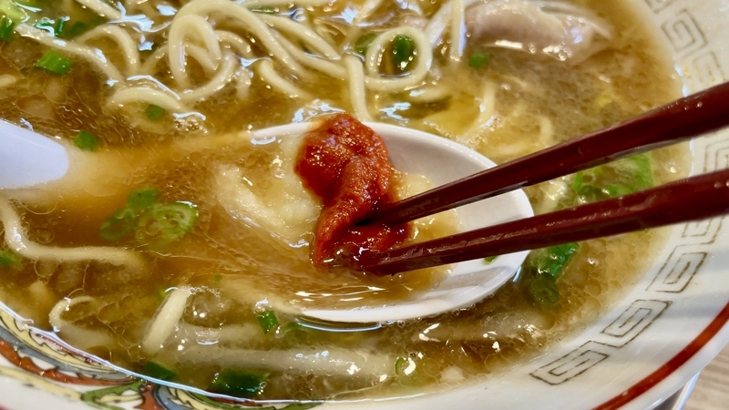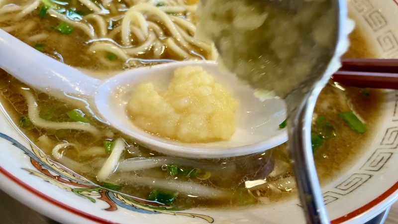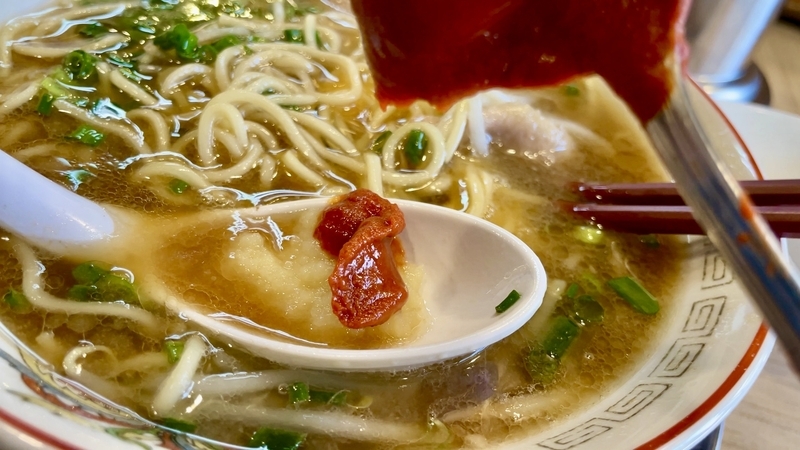 まぁこれをしないと落ち着かないので、ルーティーンのように味変化。ニンニクポットから1回分垂らします。続いて豆板醤を垂らし、レンゲの中で出汁で軽く溶いてから出汁に沈めて撹拌。終盤にパンチ力発揮!