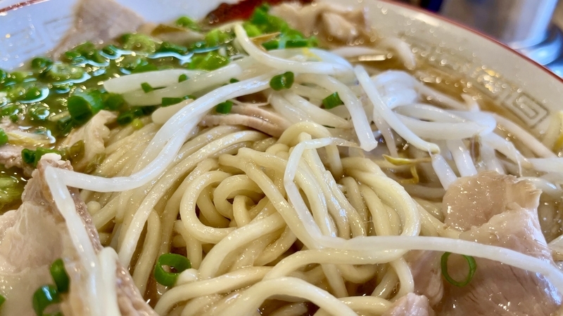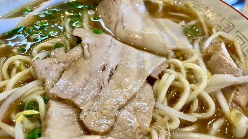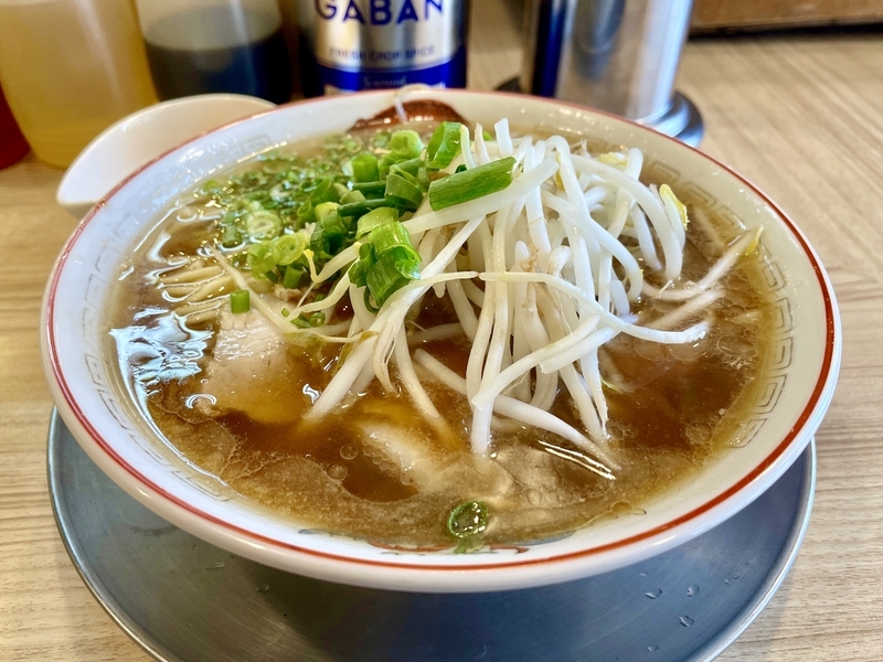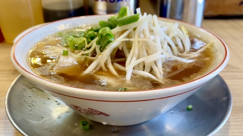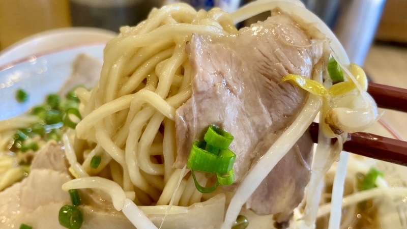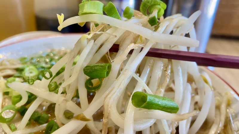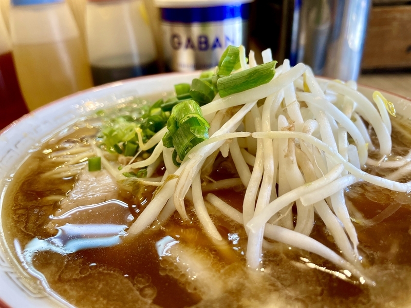 参考対象は、きっと「第一旭」と思われますが、オリジナリティーも感じさせます。具材は焼豚スライスとモヤシと多めの青葱と言うシンプルな構成。それぞれマシマシ状態になって、スープが少々こぼれ落ちるほどです。