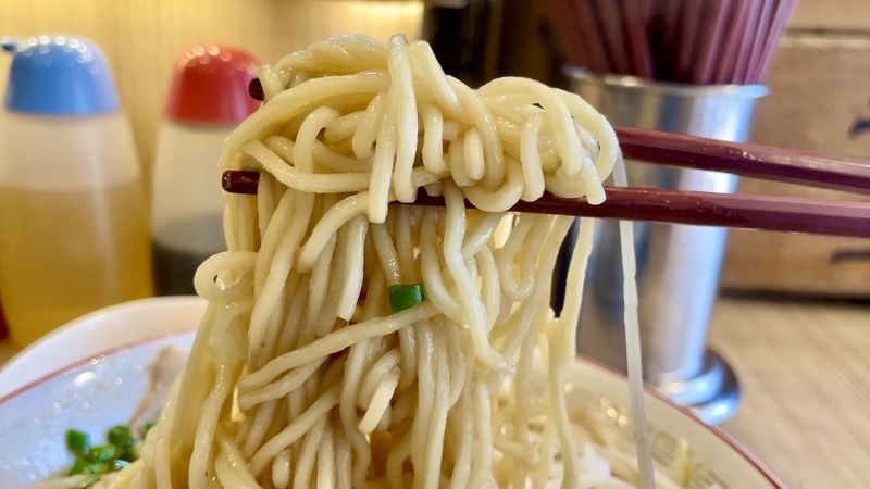 <麺> 滑らか地肌で出汁絡みまくり仄かにグラマスで噛むと風味を感じさせるストレート細麺!