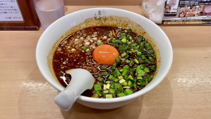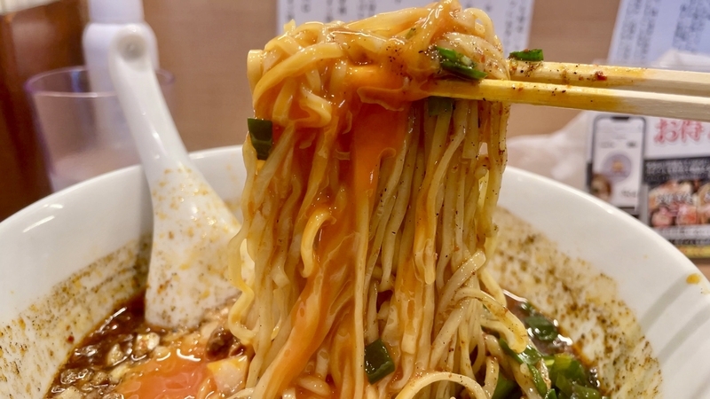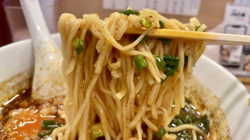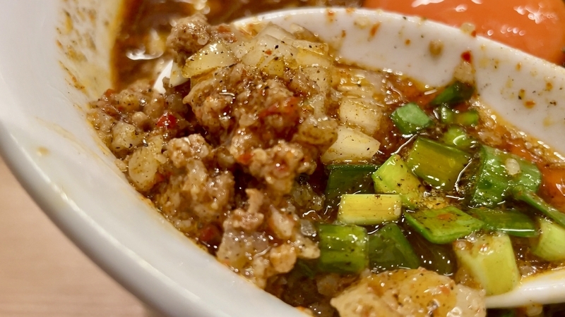 さて宣材より実物はヘビーだった。写真では「ピり辛」とあって辣油の赤が強調されてるから唐辛子系ホットな一杯かと思っておりましたが、配膳を受けると胡椒類の黒さが案外目立つ。立ち昇る香りに、花椒の存在感がありあり!。想像以上の麻薬的刺激に興奮するばかり也。