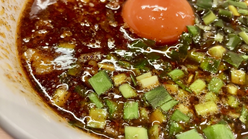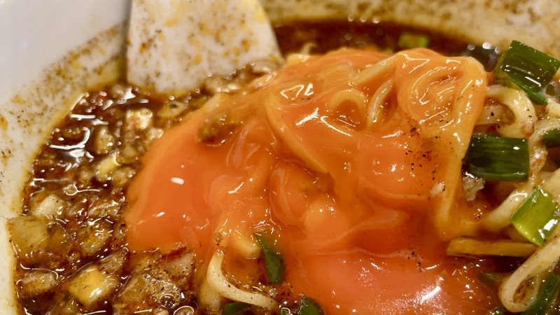 <全体> イメージ的にはパワフル台湾拉麺風!韮の緑と辣油の赤!花椒の黒と卵黄の黄!色合いも重厚!