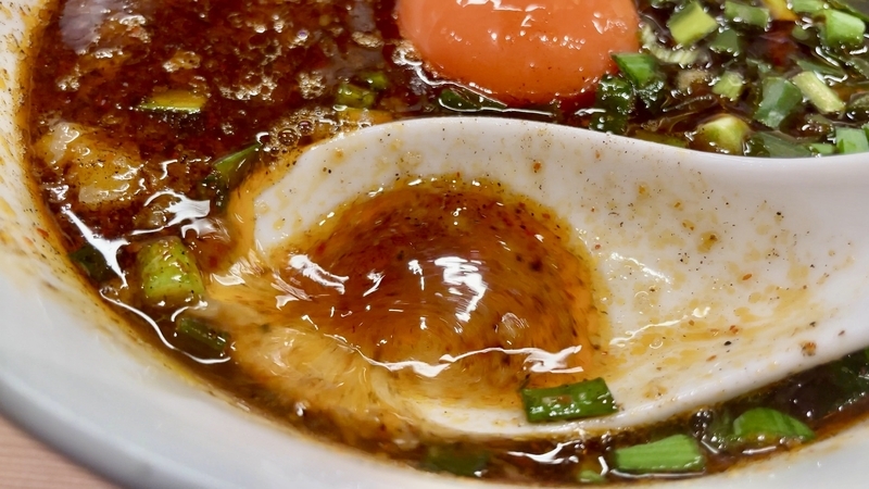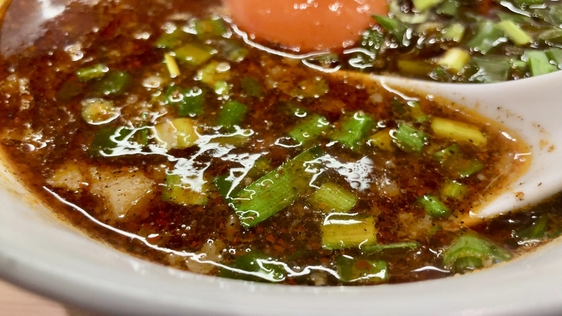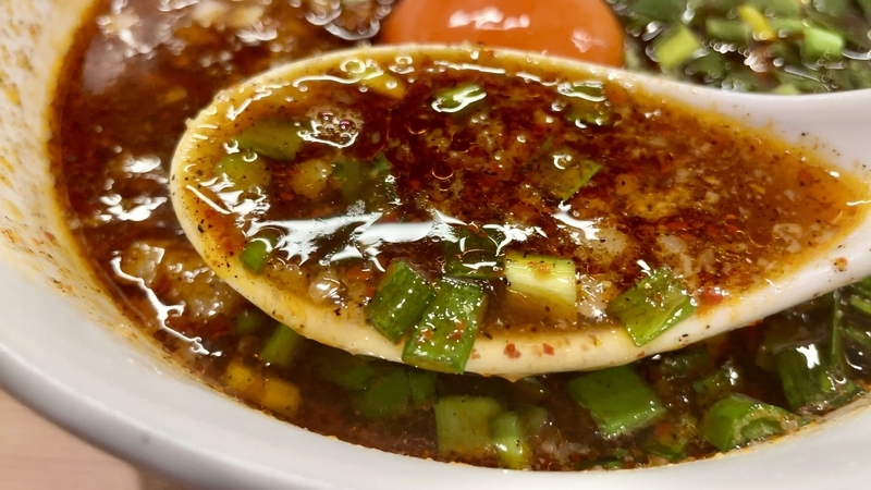 <出汁> 円やかな醤油出汁に韮と大蒜の個性が滲む!辣油と花椒のパンチ力が溶け込み軽く汗をかく